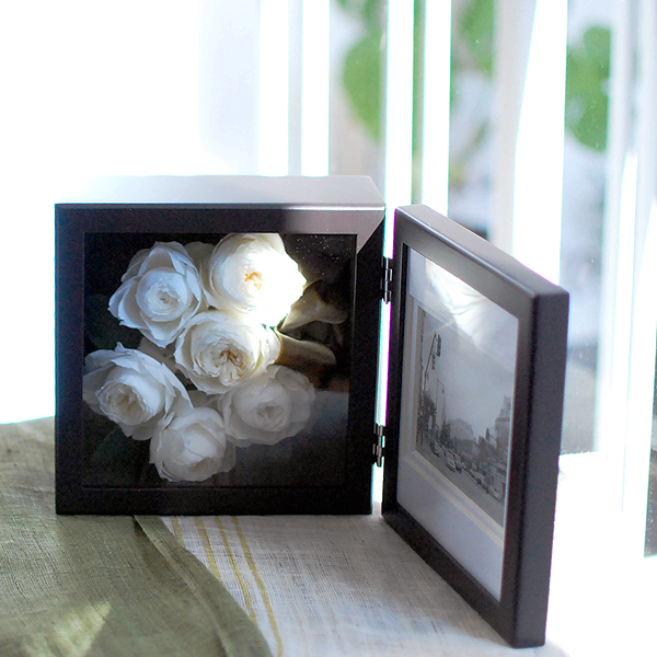 フレーム外寸サイズ17.5cm正方形H8cm、全面ガラス。 花が入る部分14cm製合計H6cm